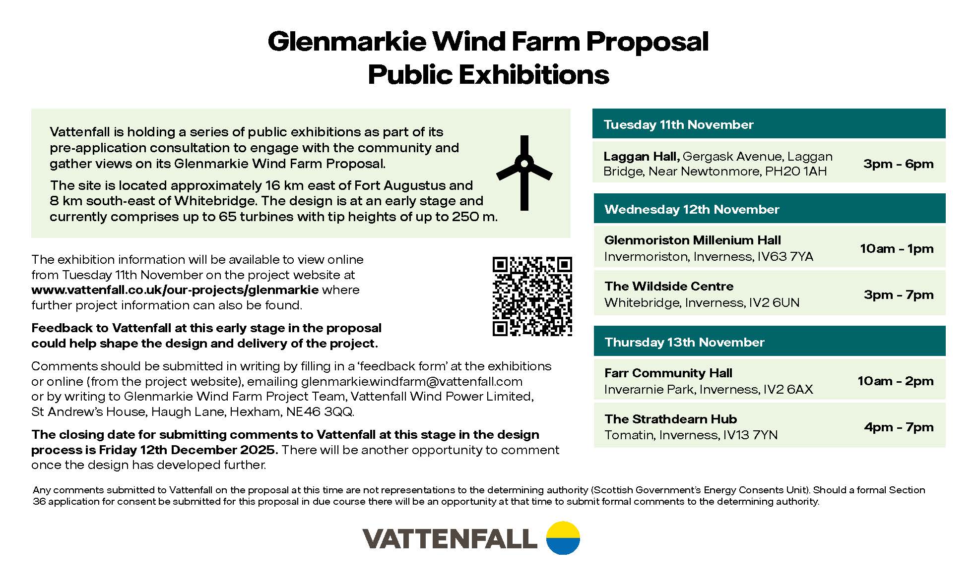 You can reach the Glenmarkie Wind Farm project team at the following email address glenmarkie.windfarm@vattenfall.com or by writing to: